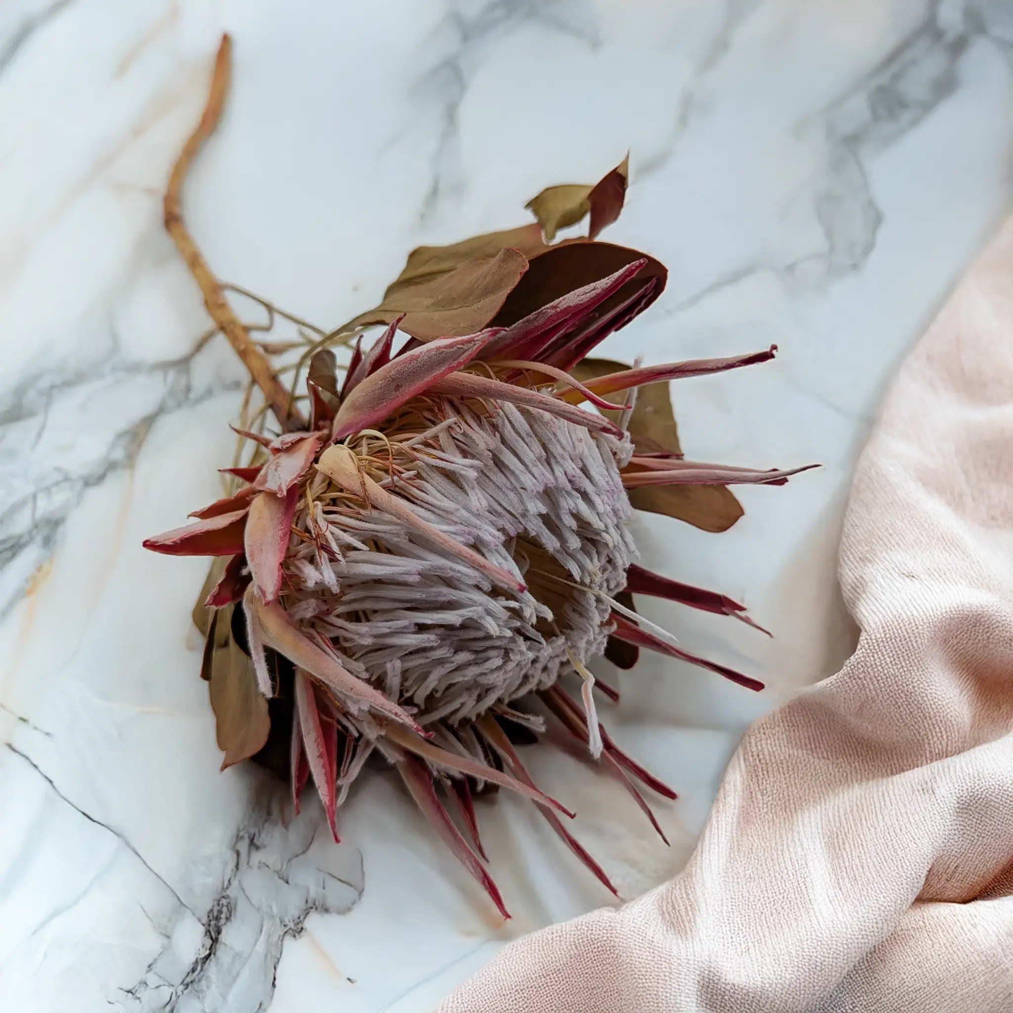 Protea King to majestatyczny, egzotyczny kwiat uznawany za królową wśród roślin suszonych. Jej imponujące, stożkowate kwiatostany w naturalnych odcieniach czerwieni i różu nadają aranżacjom wyrazistości, luksusu i charakteru. W formie suszonej zachowuje swój kształt i walory dekoracyjne przez długi czas.