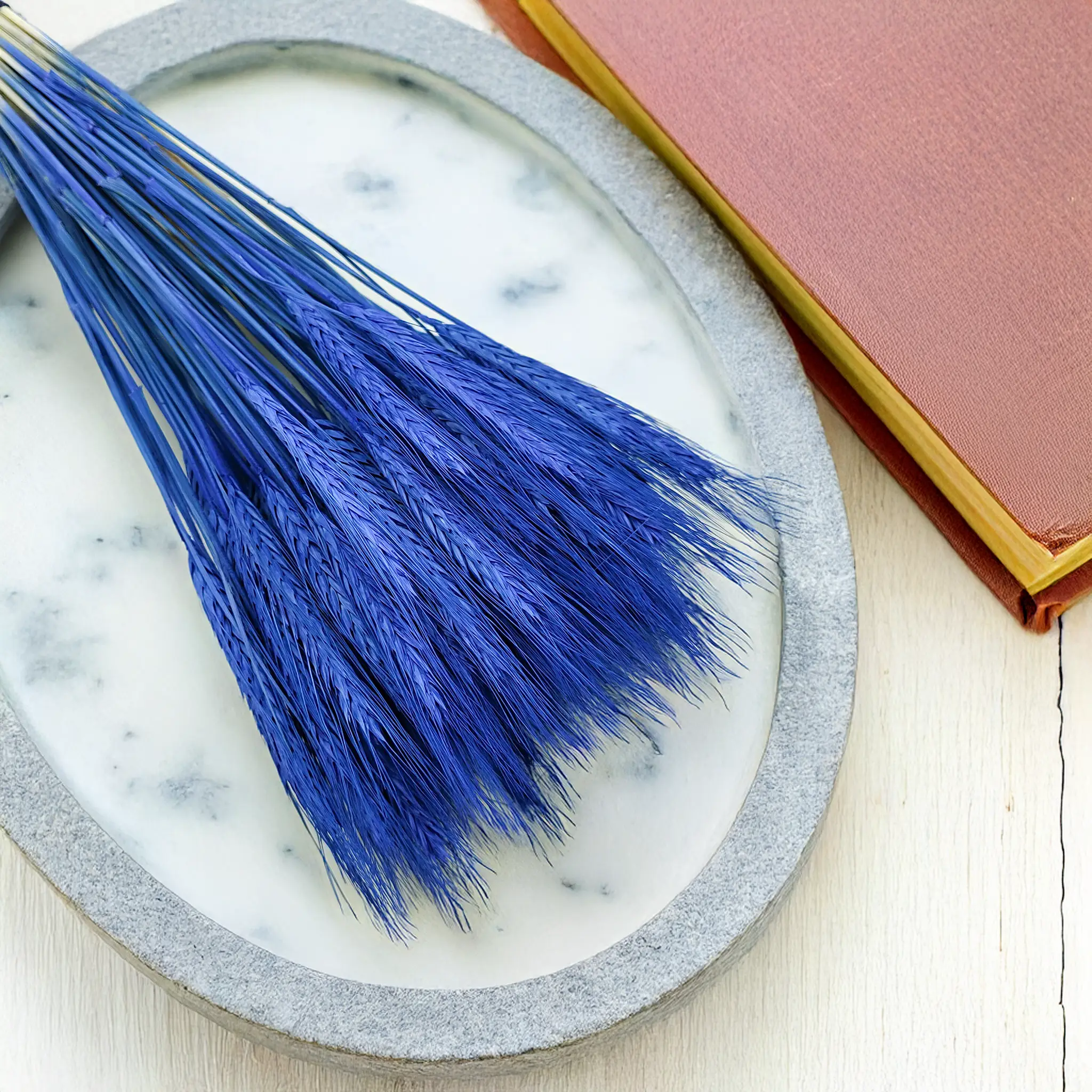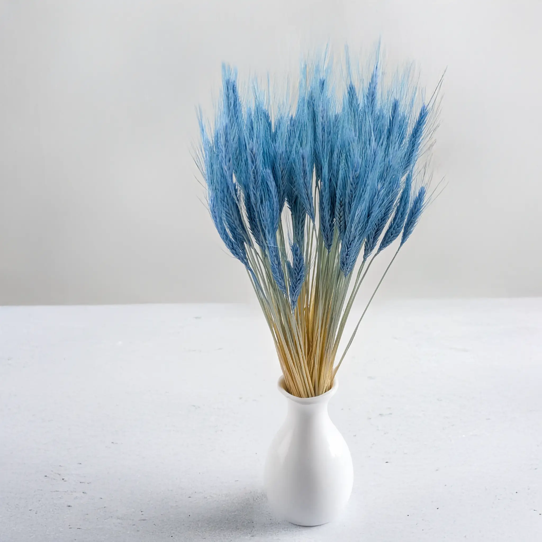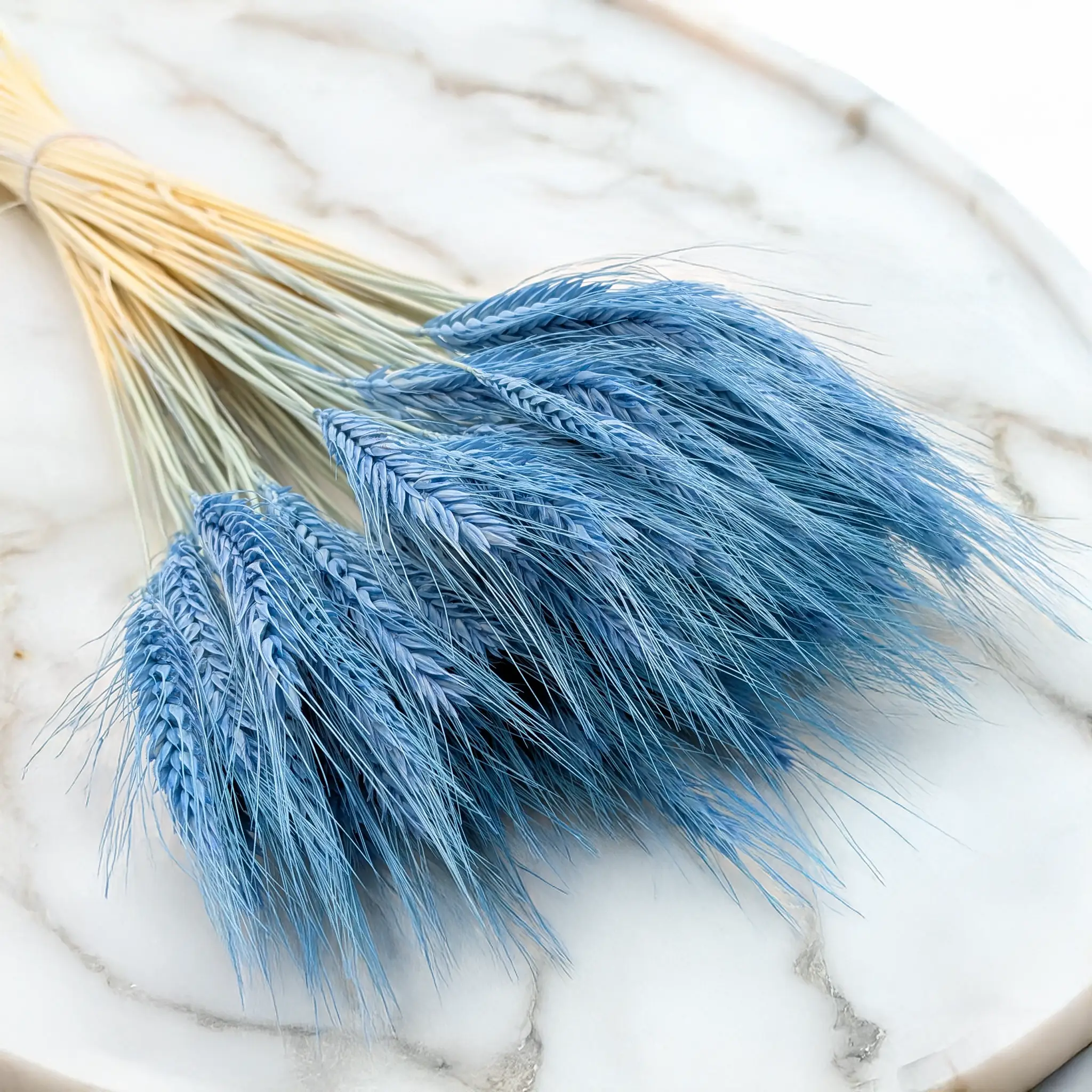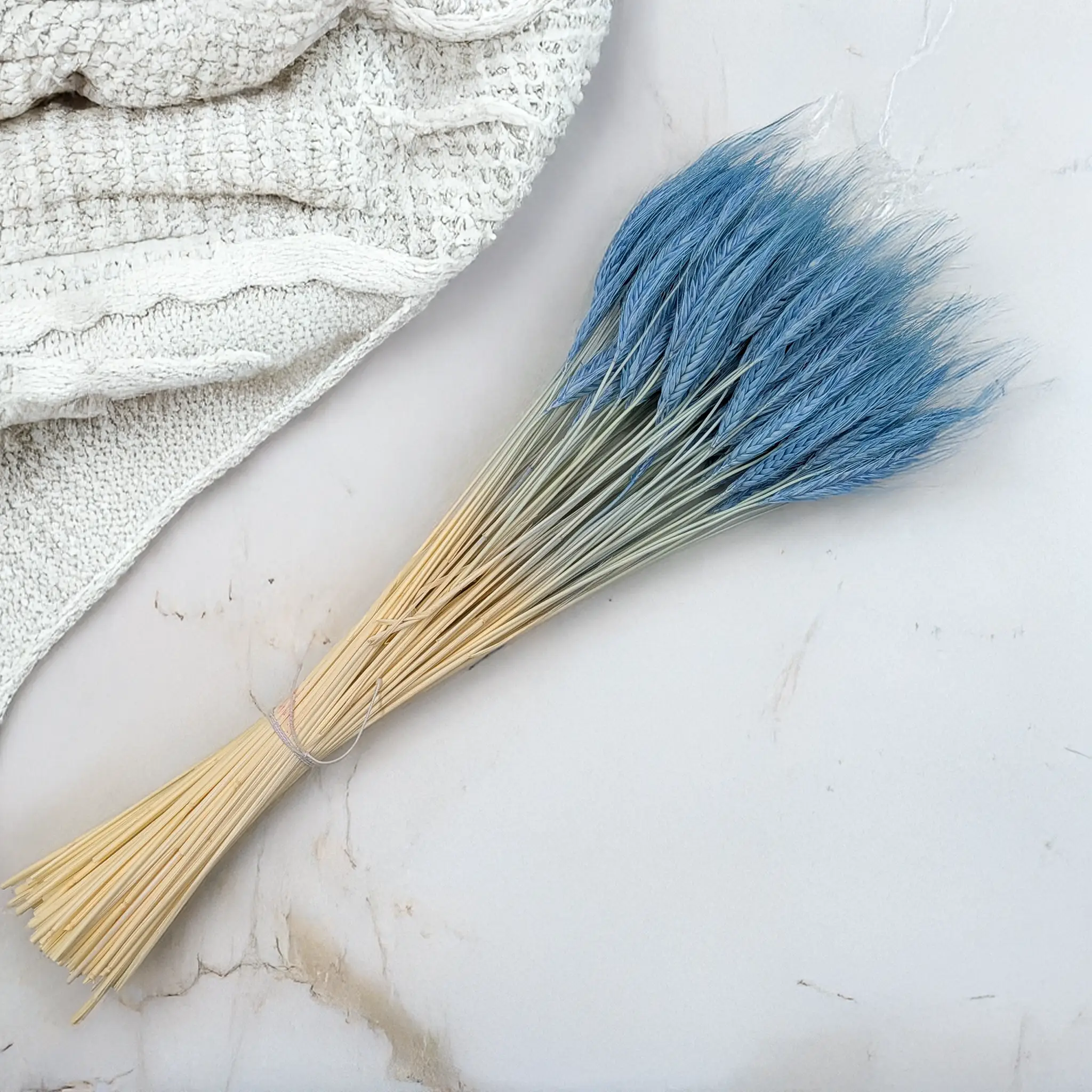 Niebieskie suszone pszenżyto to niezwykła dekoracja, która przyciąga uwagę swoją intensywną, chłodną barwą. Symbolizuje kreatywność, spokój i głębię – doskonałe do kompozycji z nutą nowoczesnej elegancji lub artystycznego minimalizmu.