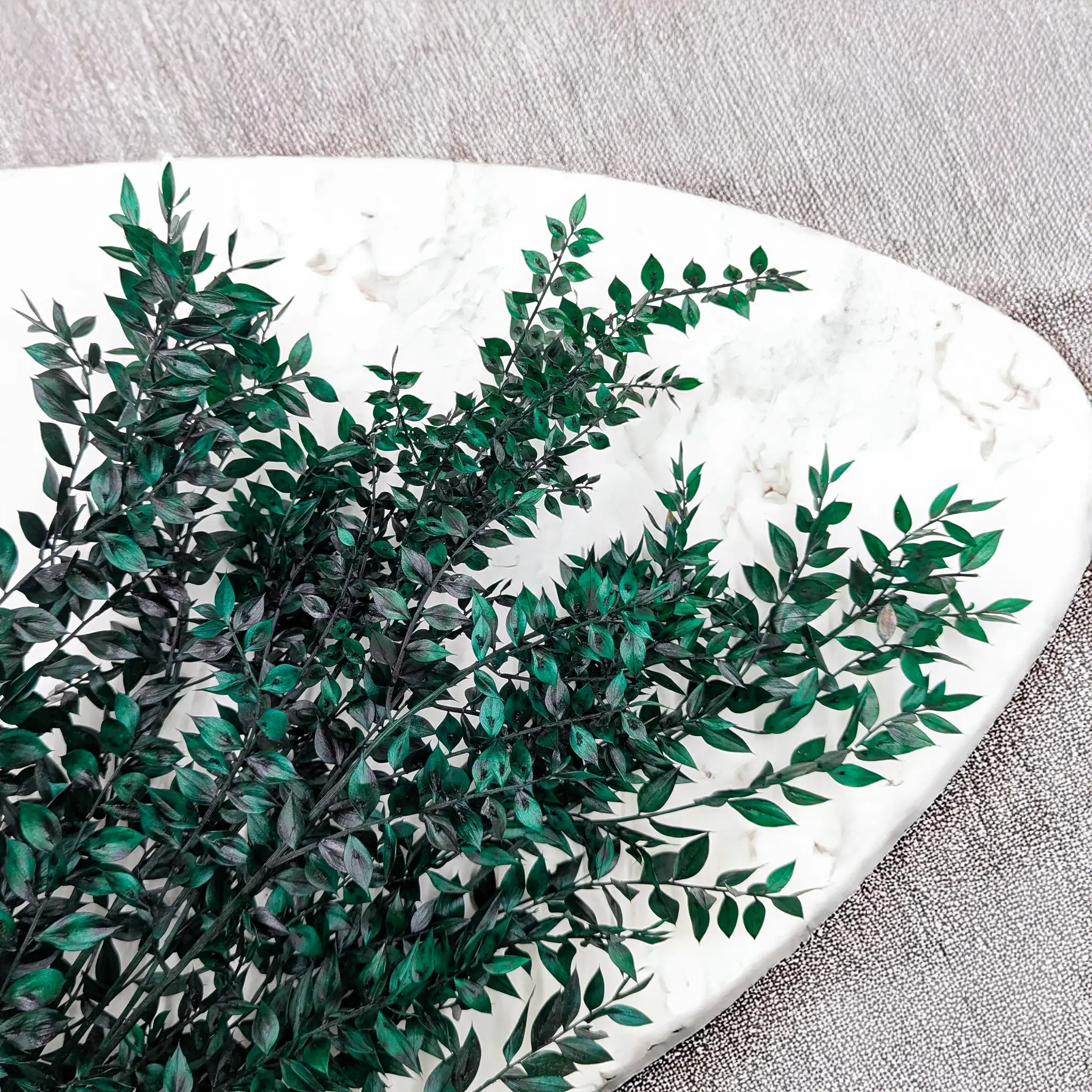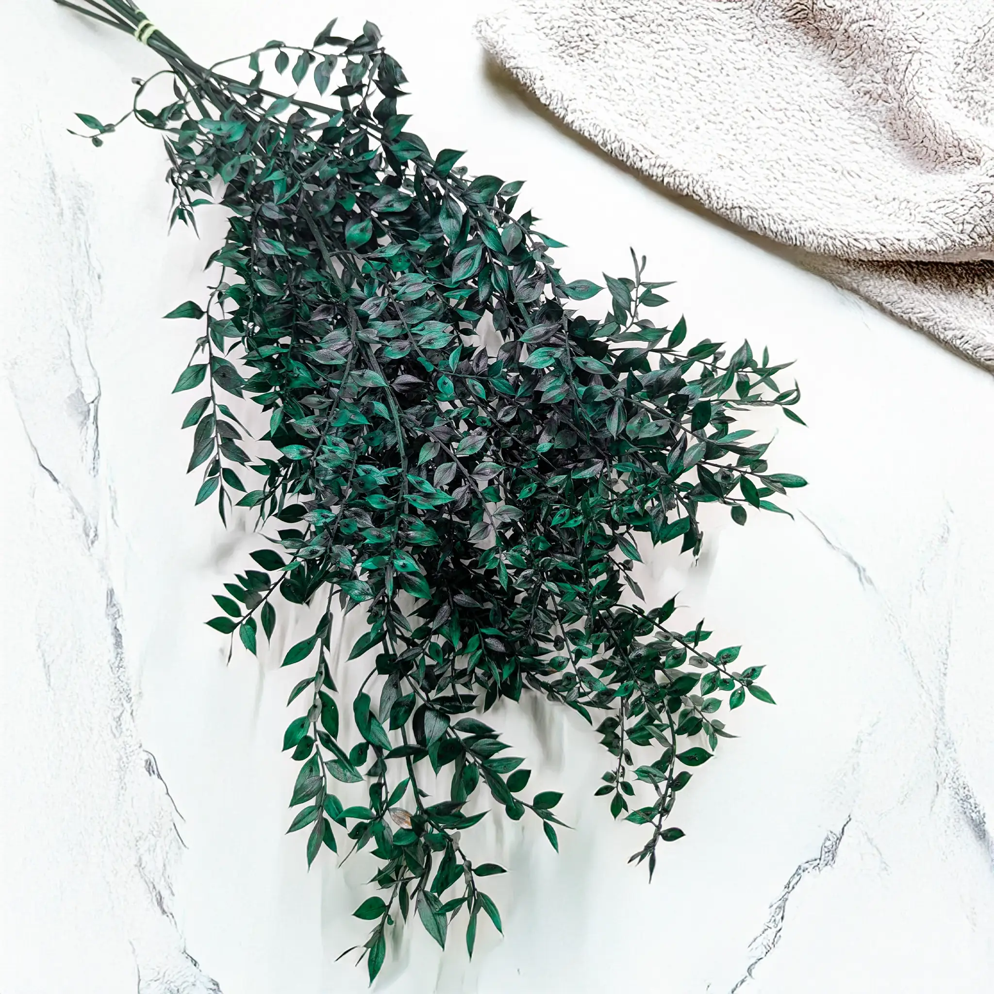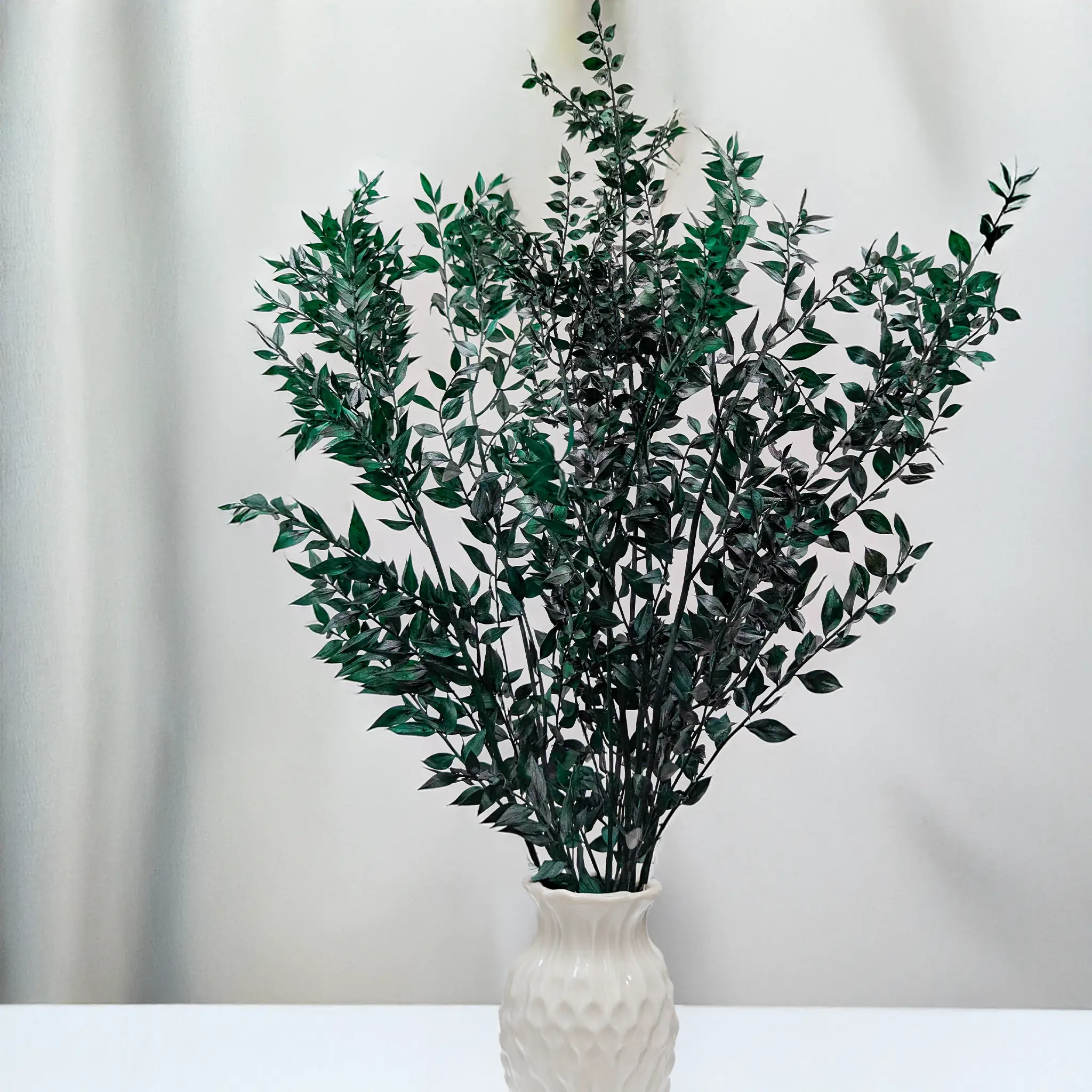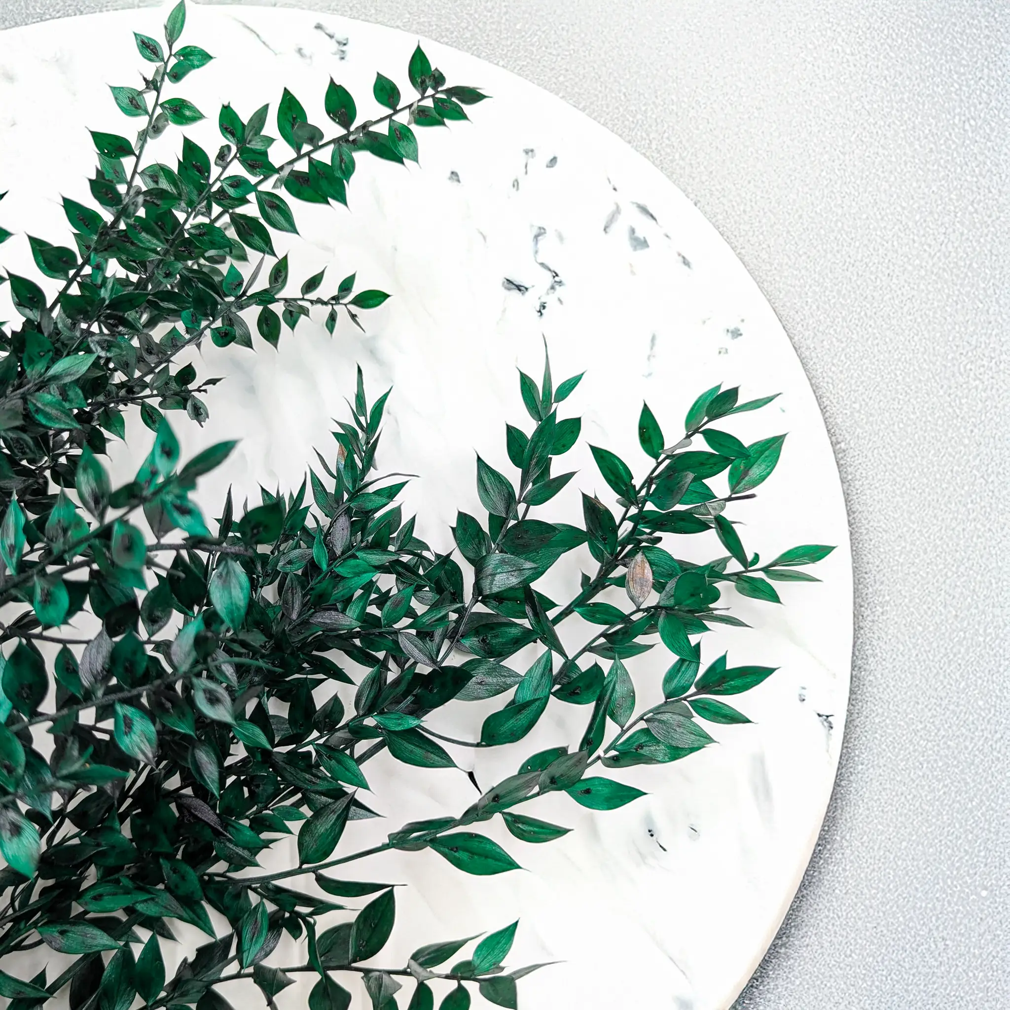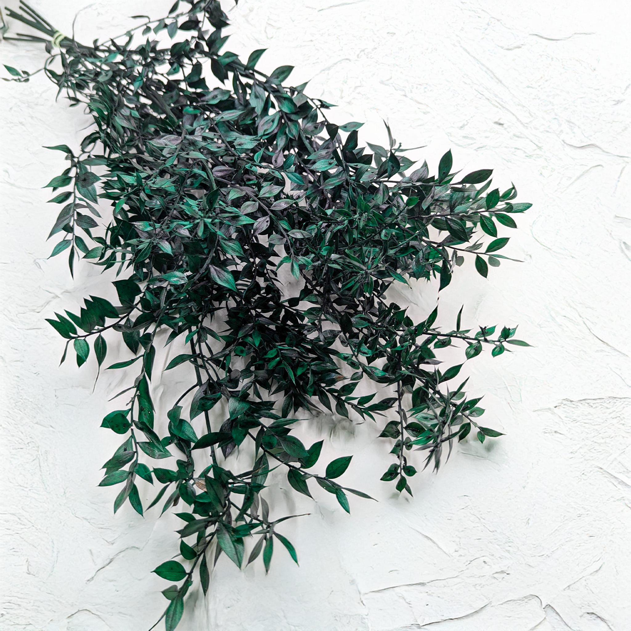 *Każdy egzemplarz jest naturalny i unikalny – nie ma dwóch identycznych. Ruskus zielony jest barwiony, dlatego jego intensywna barwa może farbować w kontakcie z innymi powierzchniami. Z czasem kolor może delikatnie blaknąć. Produkt należy przechowywać z dala od wysokiej wilgotności, bezpośredniego słońca, źródeł ciepła oraz skrajnych temperatur. Złamane lub nadłamane liście i łodygi są naturalną cechą tego typu roślin.