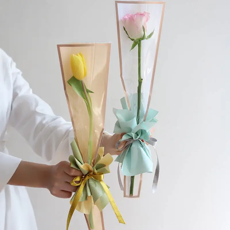 Wykonany z przezroczystej, usztywnionej folii z dekoracyjną ramką, opakowanie na jeden kwiat prezentuje się wyjątkowo estetycznie, jednocześnie zabezpieczając zawartość.