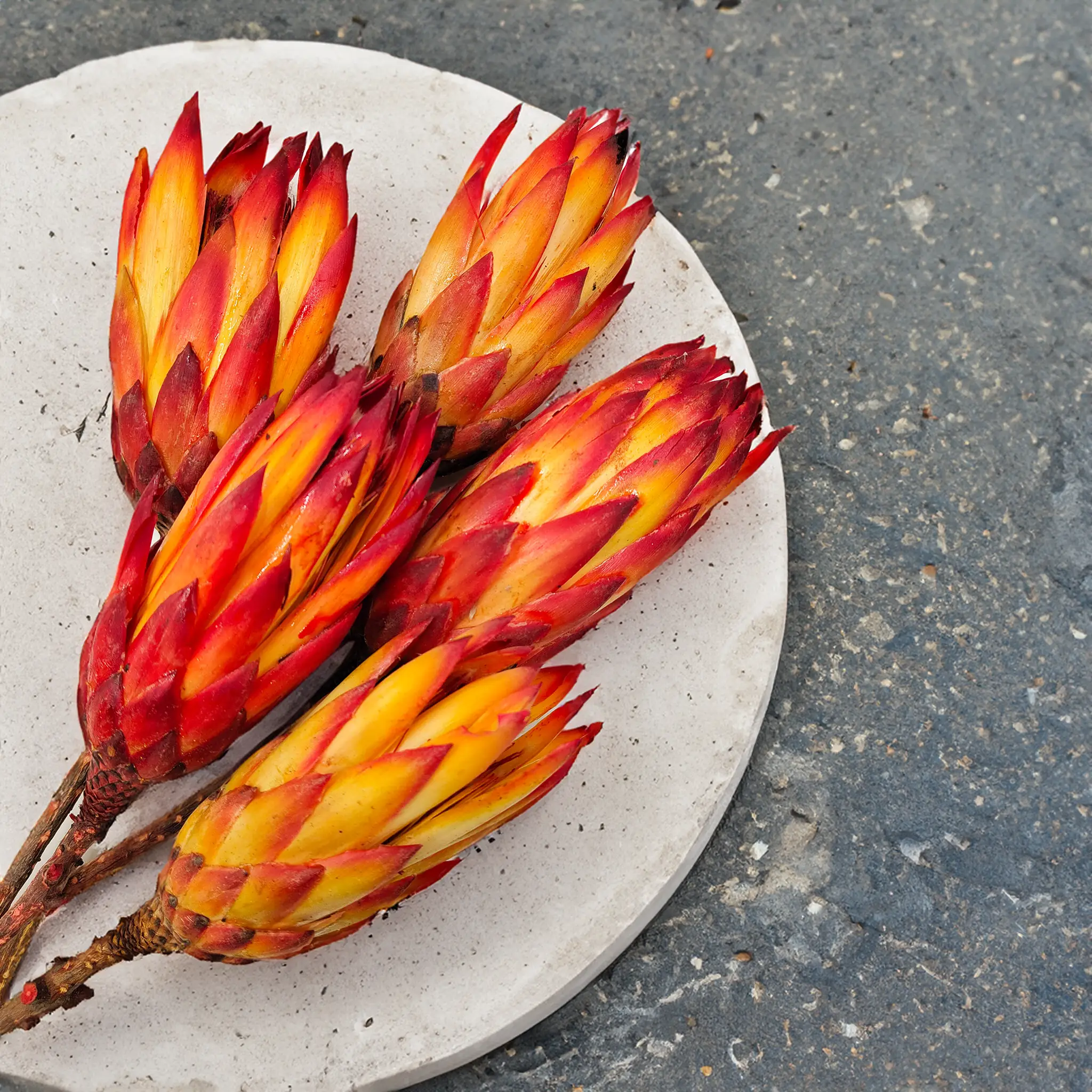 Protea repens, zwana również cukrową proteą, to wyjątkowy gatunek pochodzący z południowej Afryki – dokładnie z regionu Cape Fynbos. Suszona wersja w intensywnym czerwonym kolorze zachwyca tubalną formą zakończoną kwiatową koroną. Zestaw 5 suszonych kwiatów o długości ok. 35–40 cm to doskonały wybór do wyrazistych kompozycji boho, bukietów ślubnych, rustykalnych wiązanek i nowoczesnych aranżacji wnętrz.