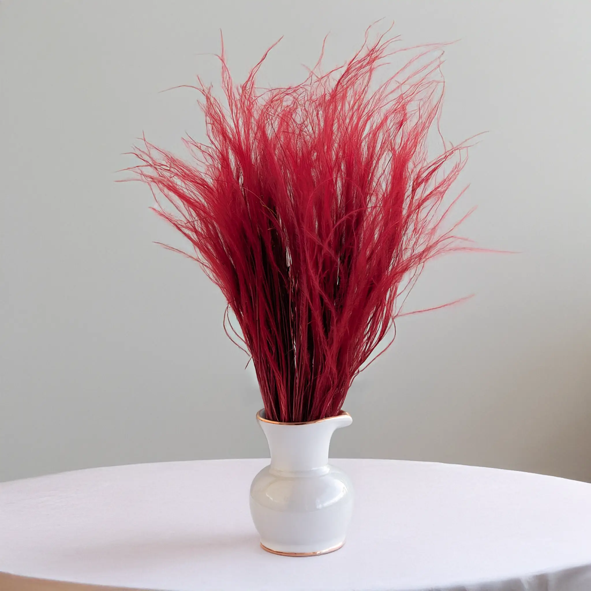 Ostnica piórkowata (Stipa pennata) w kolorze bordowym to propozycja dla osób poszukujących wyrazistego, eleganckiego akcentu dekoracyjnego. Jej miękkie, lekkie kłosy zostały barwione na intensywny odcień bordowy, który kojarzy się z głębią, luksusem i artystyczną wrażliwością. Ten szlachetny kolor pięknie podkreśla strukturę trawy, wprowadzając do aranżacji ciepło oraz nietuzinkowy, dramatyczny efekt.