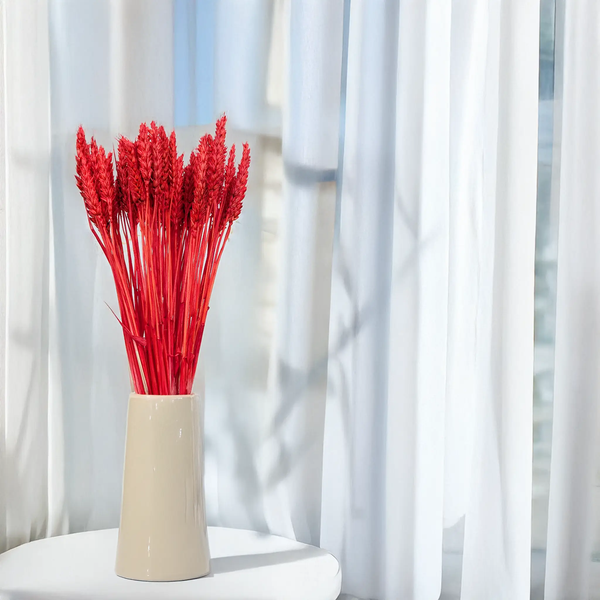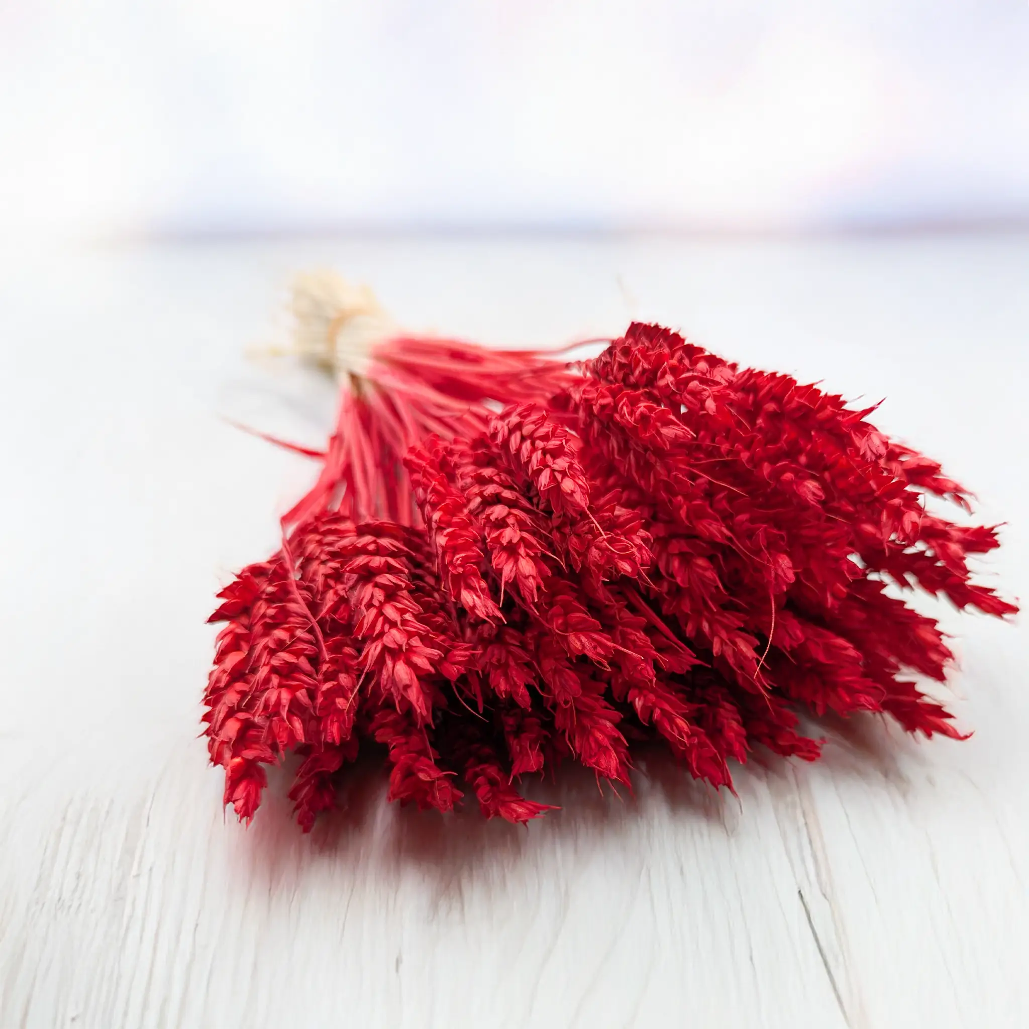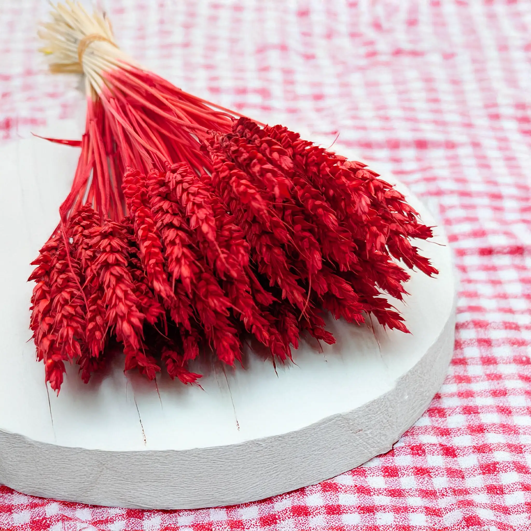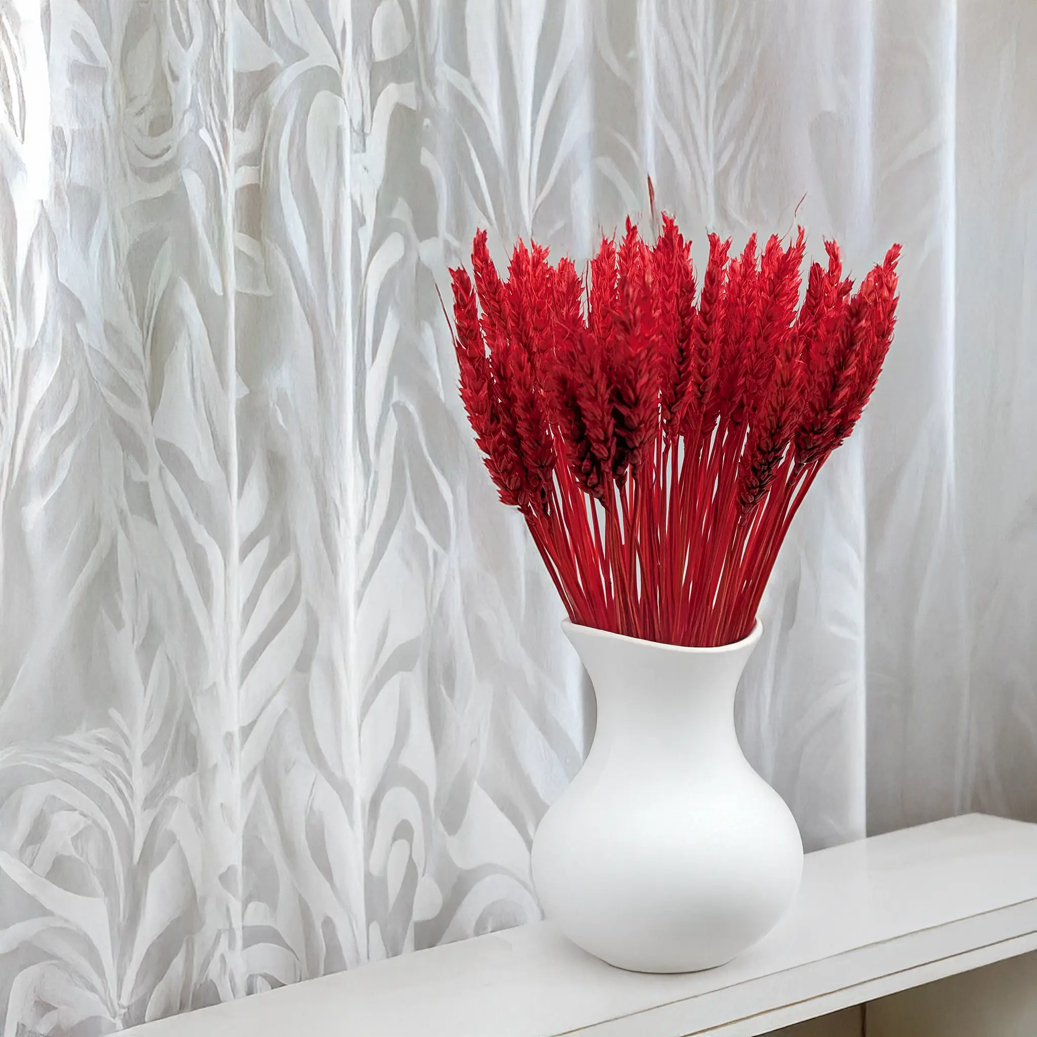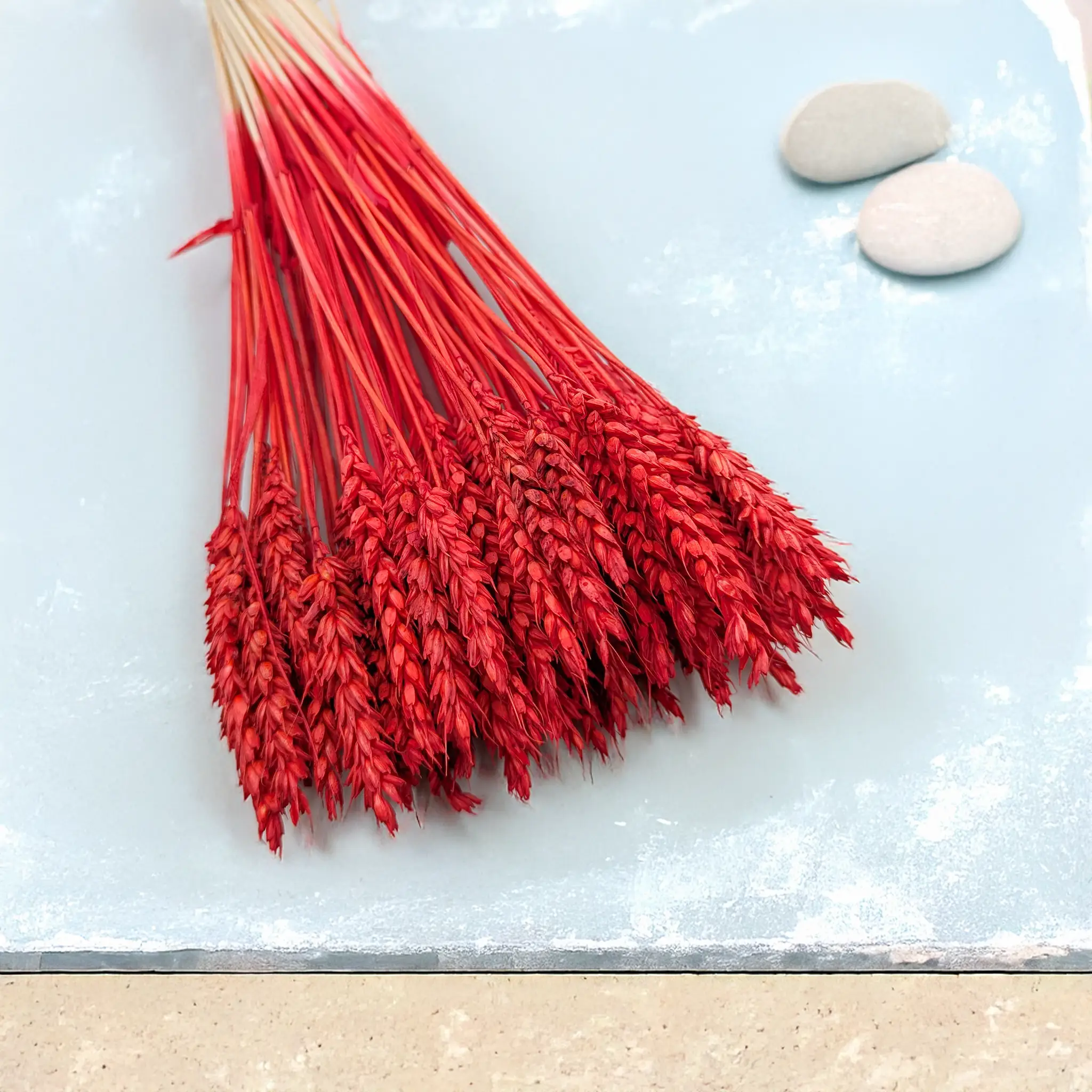 Suszona pszenica w intensywnym czerwonym kolorze to odważny i stylowy dodatek florystyczny, który przyciąga wzrok i nadaje kompozycjom wyrazistości. Symbolika czerwieni – pasja, siła, odwaga – sprawia, że to idealny wybór do świątecznych dekoracji oraz aranżacji wymagających silnego akcentu kolorystycznego.