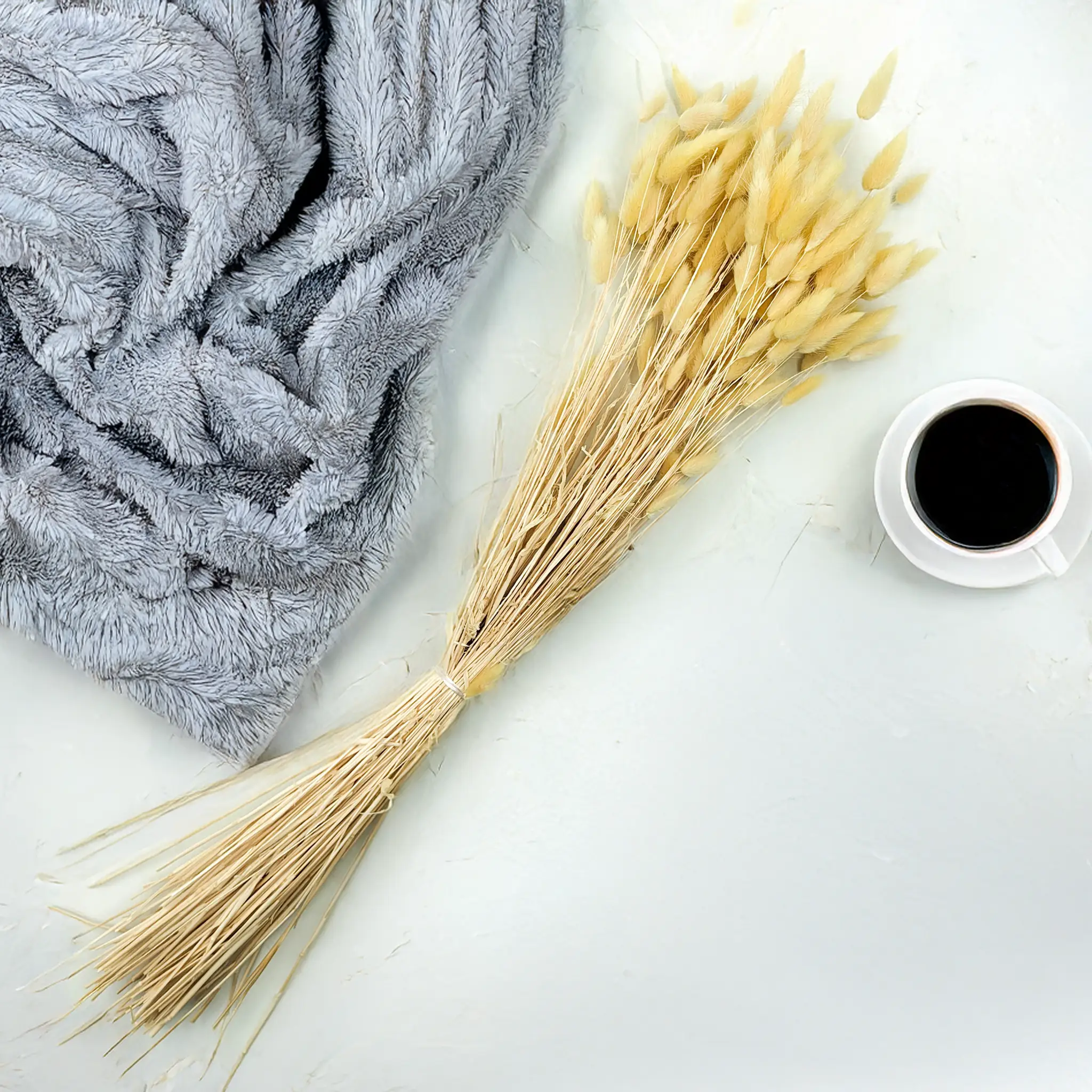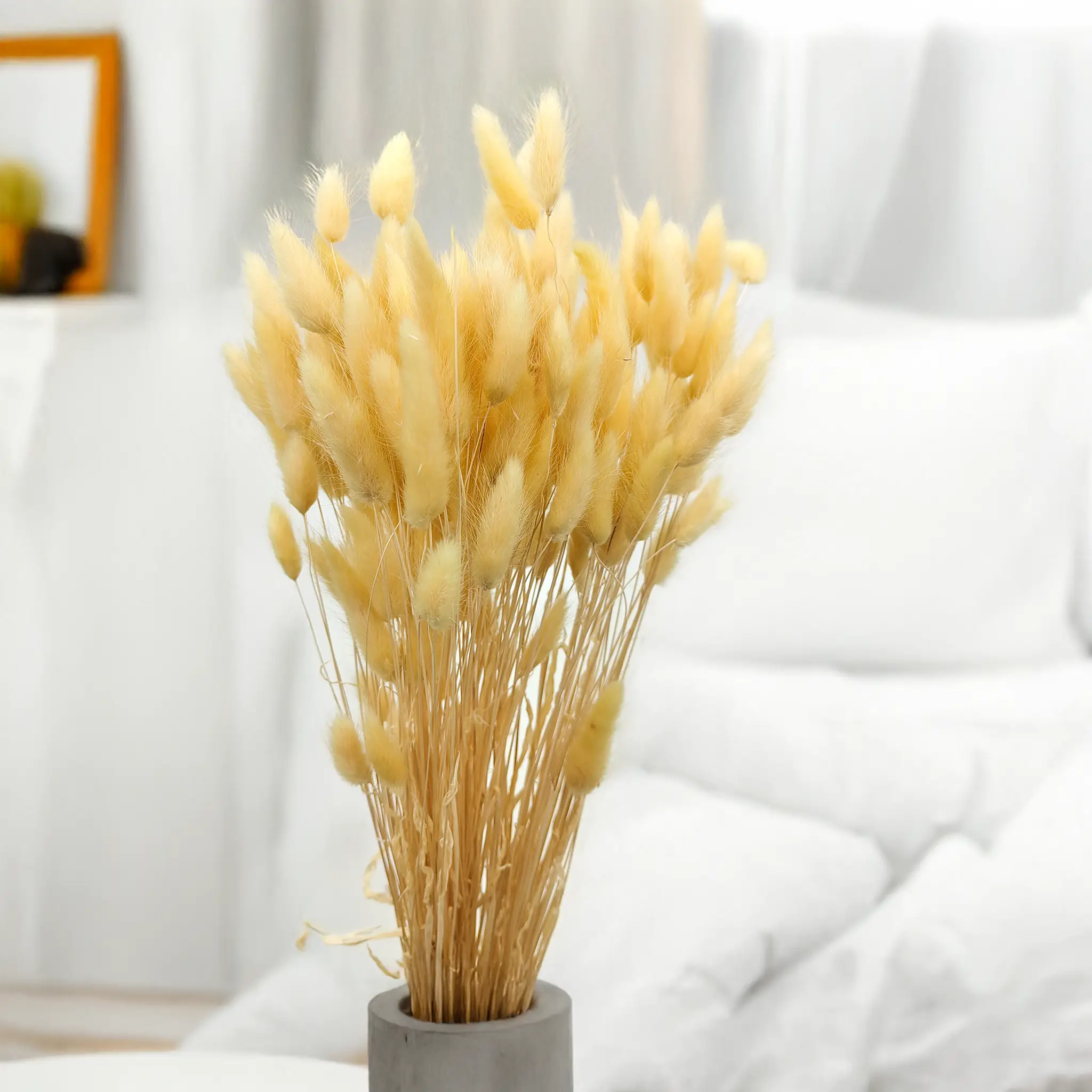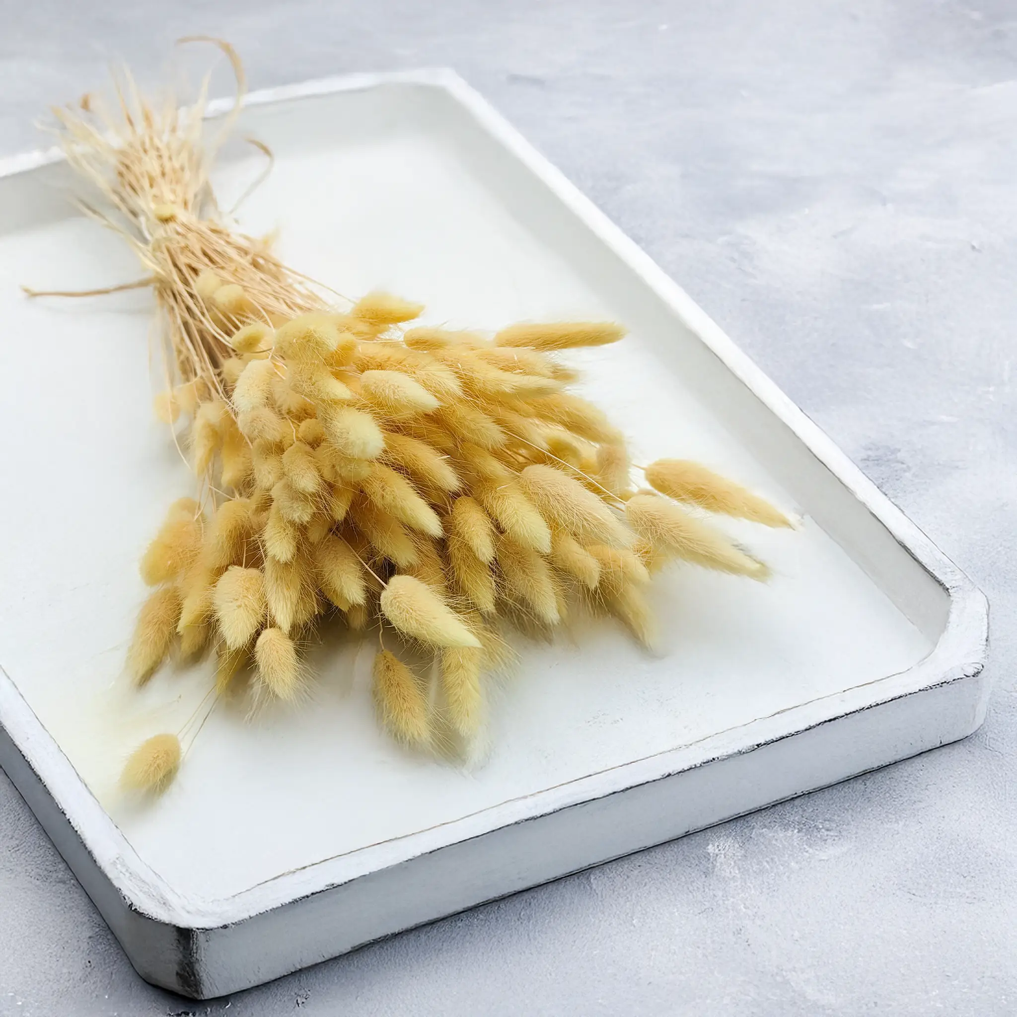 Kremowy suszony Lagurus (Dmuszek jajowaty) to ponadczasowa dekoracja o delikatnym, naturalnym charakterze. Jasny, neutralny odcień symbolizuje czystość, elegancję i spokój, dzięki czemu idealnie pasuje do klasycznych i nowoczesnych aranżacji florystycznych. Jego puszysta faktura dodaje objętości i miękkości, nie dominując przy tym kompozycji.